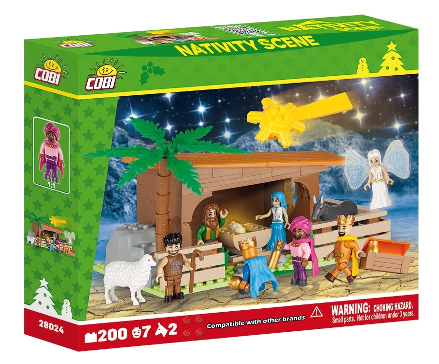 Świąteczny zestaw zawiera 200 elementów w tym 7 figurek, między innymi 2 figurki zwierzątek: osiołek i owieczka.