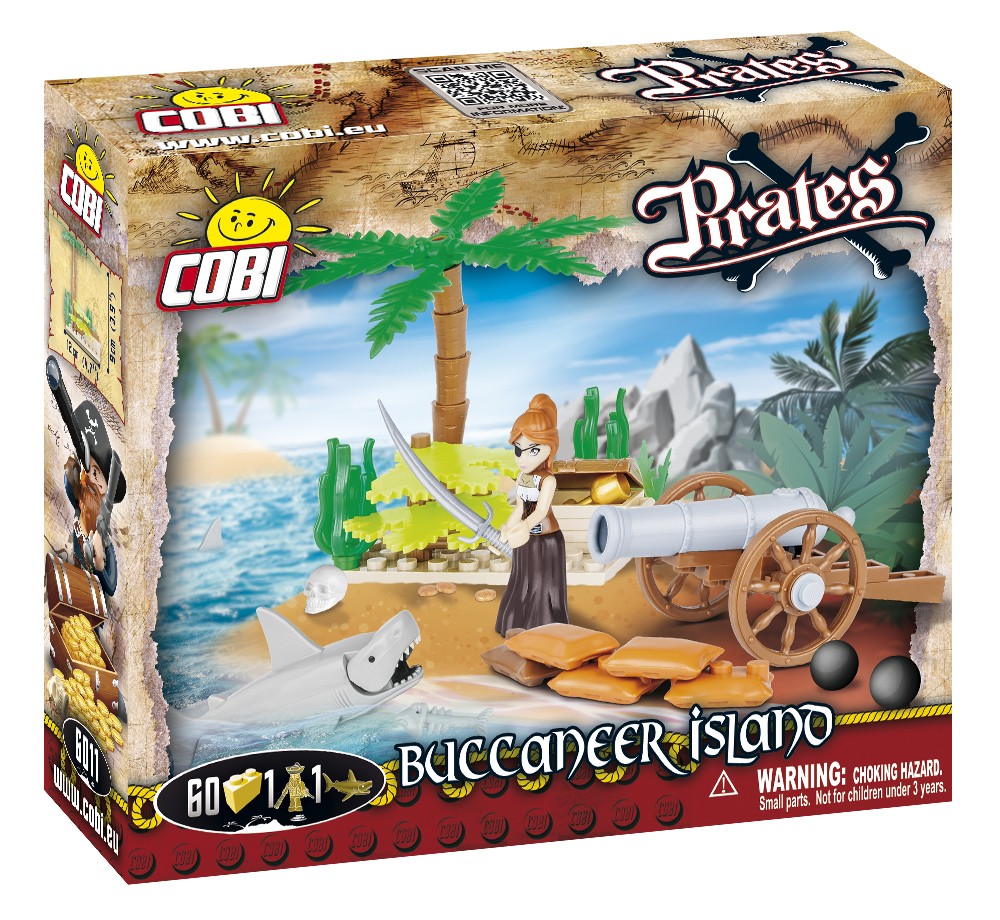 Właśnie taka wyspa strzeżona jest przez dzielną Piratkę, która z plaży obserwuje niespokojne morskie wody. Nagle z wody wyłania się groźny rekin! Można rozpocząć polowanie na rekiny! Aby skarb był bezpieczny na plaży przygotowana jest armata do szybkich działań. Piraci muszą strzec swoich łowów. W zestawie znajdziesz jedną figurkę Piratki oraz figurkę rekina.
