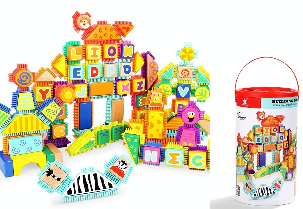 Zestaw Klocków Jeżyków w wiaderku, urozmaicony jest figurkami zwierząt i literkami. Drewniane klocki posiadaja silikonowe miękkie ramki jeżyki, dzięki czemu są łatwe do łączenia ze sobą, świetne pasują do małych rączek. Klocki wykonane są z wysokiej jakości ekologicznego drewna, pomalowane są nietoksycznymi farbami na bazie wody. Klocki maja rożne kształty, żywe kolory i łagodne krawędzi.