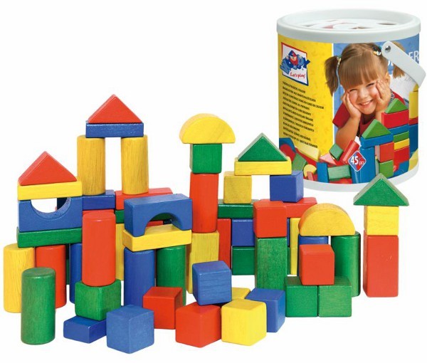 Zastosowano farby bezpieczne dla zdrowia dziecka. Wszystkie klocki znajdują się w plastikowym wiaderku. Wieczko wiaderka posiada otwory o kształtach odpowiadającym kształtom klocków. Zestaw zawiera 45 elementów.