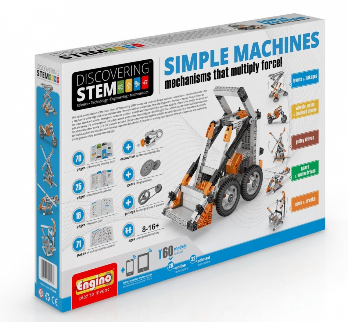 Zestaw ten jest kombinacją pięciu podstawowych zestawów serii Discovering STEM i zawiera wszystkie mechanizmy, z którymi działają maszyny proste. Mechanizmy te są najważniejszymi elementami licznych maszyn i urządzeń, które określają ich podstawową funkcję. Są zaprojektowane do pomnażania lub zmniejszania mocy, zwiększania lub zmniejszania prędkości albo do przekształcania typu ruchu w inny. Z zestawu można zbudować 60 rodzajów działających modeli, które obejmują temat ramion, klinów, kół i wałów, śrub i pochyłych płaszczyzn, ślimaków, jak też bardziej zaawansowanych kół zębatych i złączy. Instrukcje do wszystkich modeli są łatwo zrozumiałe, a znajdziesz je w Internecie lub w dołączonej książeczce. W książeczce objaśniono szczegółowo zasady naukowe opisujące zasadę działania każdego z modeli, a także przedstawiono nowatorskie doświadczenia służące nauce praktycznej. Za pomocą quizu możesz sprawdzić, w jakim stopniu opanowałeś przedstawioną tu wiedzę.