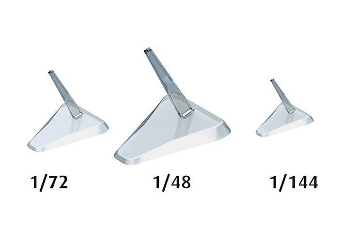 W skład zestawu wchodzą trzy podstawki wykonane z przezroczystego tworzywa sztucznego do modeli samolotów w skali 1:48, 1:72, 1:144.