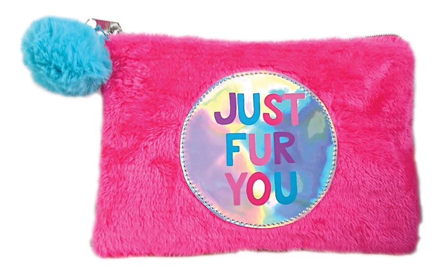 Kosmetyczka ma króciutkie, różowe futerko. Na środku znajduje się mieniący metalicznie okrąg z napisem JUST FUR YOU. Kosmetyczka posiada jedną komorę zamykaną na zamek błyskawiczny, na końcu którego dynda niebieski, futerkowy pompon.
