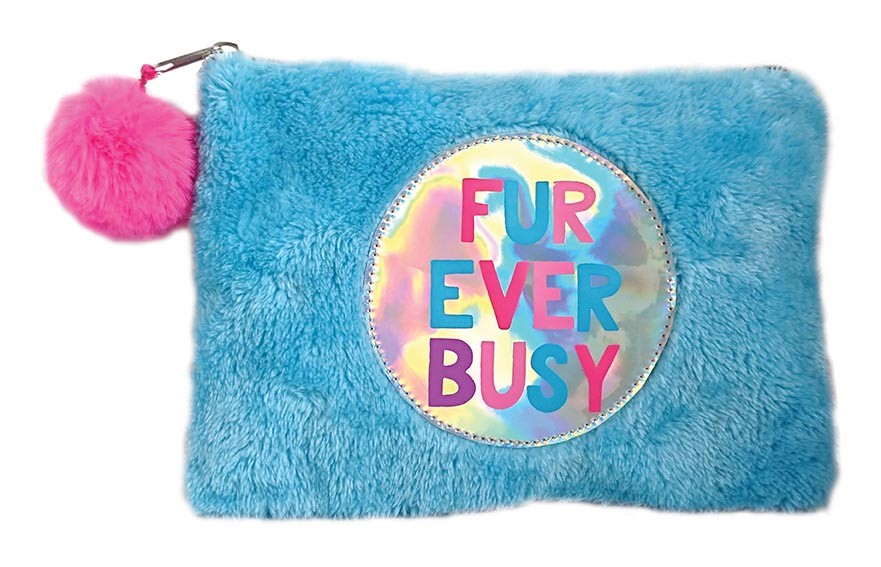 Kosmetyczka ma króciutkie, błękitne futerko. Na środku znajduje się mieniący metalicznie okrąg z napisem FUR EVER BUSY. Kosmetyczka posiada jedną komorę zamykaną na zamek błyskawiczny, na końcu którego dynda różowy, futerkowy pompon.