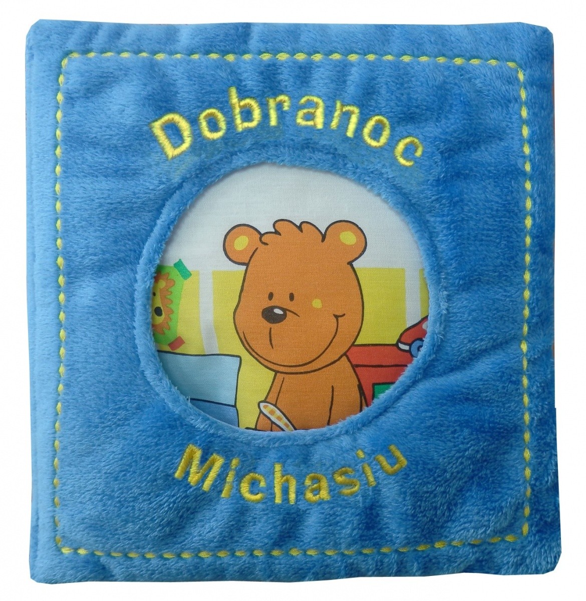 Książeczka Dobranoc Michasiu ma piszczący budzik oraz trójwymiarowe elementy np.: mleko w kartoniku, samochód z przyczepą, ręcznik kąpielowy.