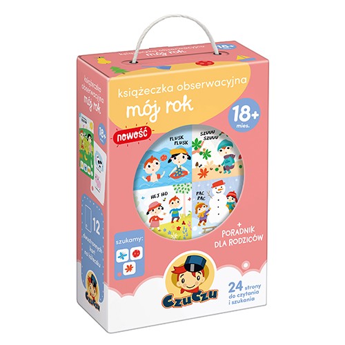 Innowacyjna Książeczka obserwacyjna Mój rok została przygotowana z myślą już o 18-miesięcznych maluchach i jest naturalną kontynuacją Książeczki obserwacyjnej Mój dzień. To zaproszenie do kreatywnej lektury i wspólnego odkrywania świata. Na 12 dużych dwustronnych kartach prezentuje tematy bliskie dzieciom: barwne ilustracje przedstawiają to, co dzieje się wokół nich wiosną, latem, jesienią i zimą. Oryginalny pomysł na angażującą zabawę polega na wyszukiwaniu przez maluchy na barwnych ilustracjach elementów z ramki, co jest znakomitym ćwiczeniem spostrzegawczości i koncentracji.