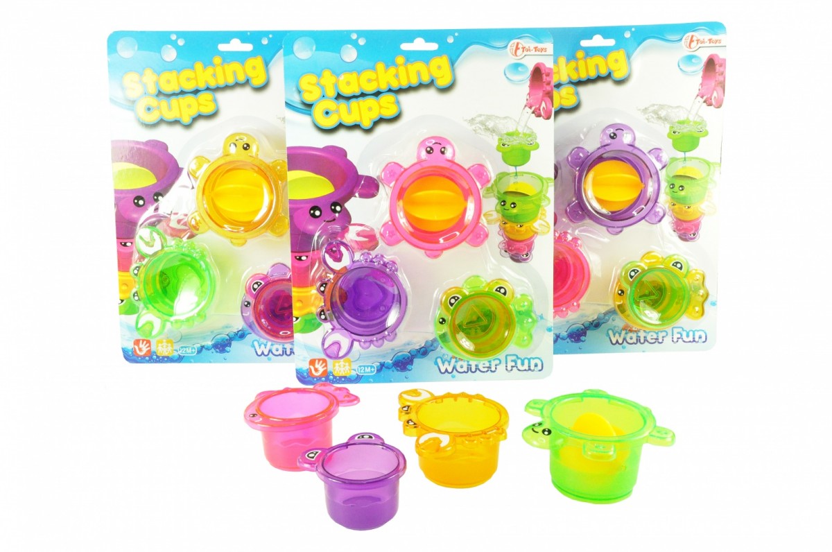 Kubeczki zwierzątka do kąpieli firmy Toi-Toys przedstawiają różne zwierzęta wodne, które można dowolnie układać w wieże i przelewać przez nie wodę.