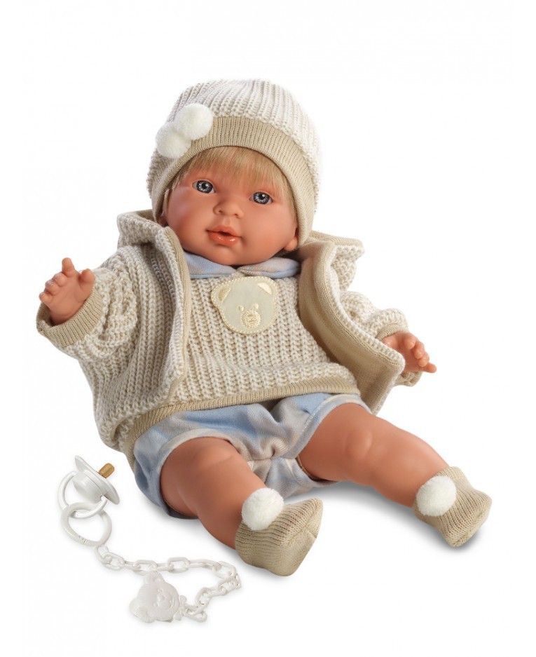 Ma na imię Alvaro. Lala wykonana jest z wysokiej jakości materiałów. Jej brzuszek wypełniony jest mięciutką wyściółką. Rączki, nóżki, buzia zrobione zostały z przyjemnego w dotyku winylu. Nasza lalka ubrana jest w elegancki komplecik-jasne spodenki z czerownymi wzorkami i czerwony sweterk. Główkę Sashy zrobi piękna czapeczka z uroczymi uszkami, które są bardzo modne w tym sezonie. Lalka zapłacze, gdy wyjmiesz smoczek z jej buzi i zawoła "mama, papa!"