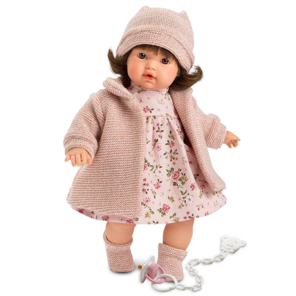 Lalka Aysel 33328 ma 33 cm i wykonana jest z delikatnego, przyjemnego w dotyku winylu. Jej miękki brzuszek wypełniony jest wyściółką. Po wyjęciu smoczka Alysel zapłacze i powie "mama, papa". Lala ma brązowe oczy otwarte na stałe oraz brązowe, półdługie, proste włosy z grzywką. Ubrana jest w doskonałej jakości jasnoróżową sukienkę w kwiatki w angielskim stylu. W komplecie znajdują się także dzianinowy, różowy płaszczyk, czapeczka i skarpetki.