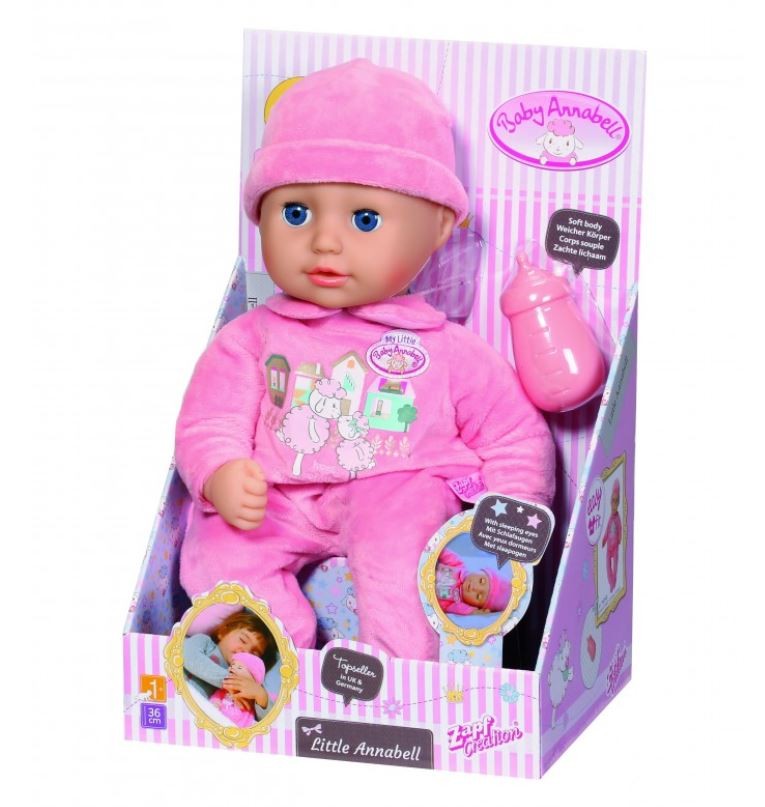 Mała Baby Annabell ma mięciutki tułów, gumową główkę, ręce i nogi, które bez problemu można ścisnąć. Nadaje się idealnie do przytulania. Laleczka ma pięknie, niebieskie oczy z ruchomymi powiekami, które zamykają się lub otwierają, w zależności od pozycji, w jakiej trzymamy bobaska. Lalka ubrana jest w cudowne, różowe, mięciutkie i miłe w dotyku śpioszki z uroczym nadrukiem. Na główkę można założyć jej czapeczkę do kompletu. Do zestawu dołączono różowa butelkę ze smoczkiem dla lalki.