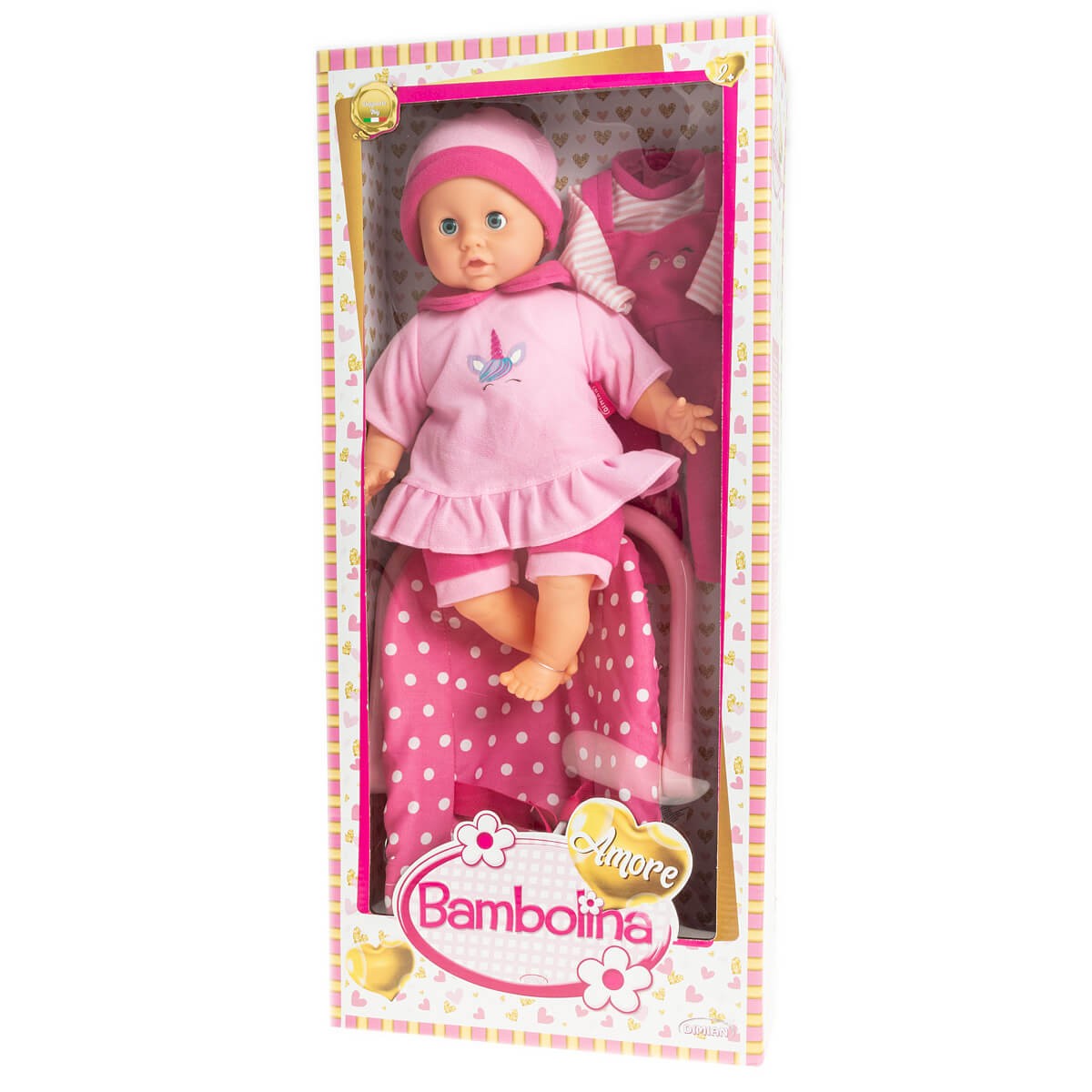 Lalka Bambolina Amore wyglądem przypomina prawdziwe dziecko. Mięciutka lala jest wykonana z przyjemnego w dotyku materiału. Jej oczy ruszają się. Zestaw zawiera dodatkowe ubranko i leżaczek.