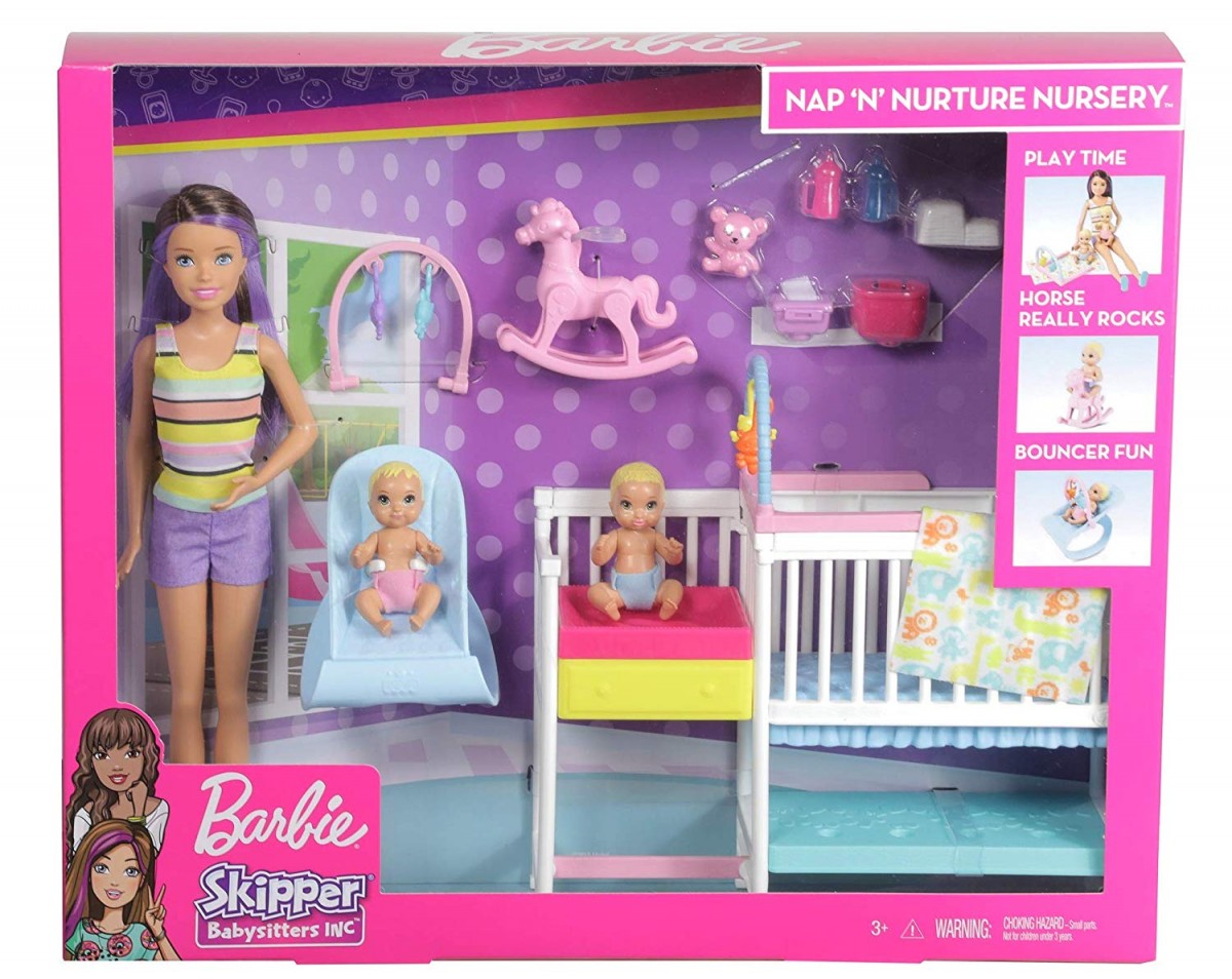 Lalki i zabawki z linii Barbie Klub Opiekunek pozwalają dzieciom rozwijać zmysł opiekuńczości. Wciel się w rolę niani i pomóż Skipper w opiece nad dwoma uroczymi niemowlakami. Aż 15 elementów, w tym łóżeczko z przewijakiem, pozwala opowiadać różnorodne historyjki. Dzieci mogą ćwiczyć karmienie, przewijanie i zabawę z dwiema lalkami bliźniakami oraz akcesoriami zainspirowanymi klasycznymi produktami Fisher-Price.L alka nie stoi samodzielnie.