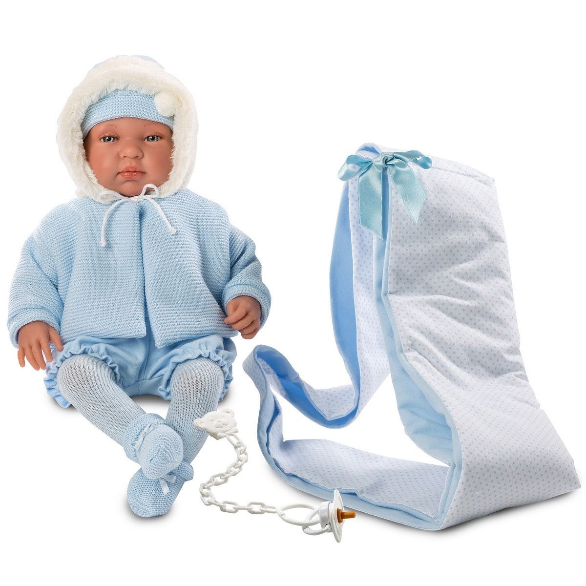 Bobas Bebo 84421 ma 44 cm i wykonany jest z delikatnego, przyjemnego w dotyku winylu. Po naciśnięciu miękkiego brzuszka lala płacze i mówi "mama, papa". Rączki i nóżki są ruchome. Dołączony smoczek pełni funkcję dekoracji. Bebo ubrany jest w błękitne body oraz dzianinowy kaftanik z kapturkiem obszyty białym misiem. Na główce ma uroczą czapeczkę z białym pomponikiem, a na nóżkach rajstopki i skarpeteczki. Do kompletu dołączona jest dwustronna chusta nosidełko w kolorach białym i błękitnym. Lala gotowa jest na spacerek!