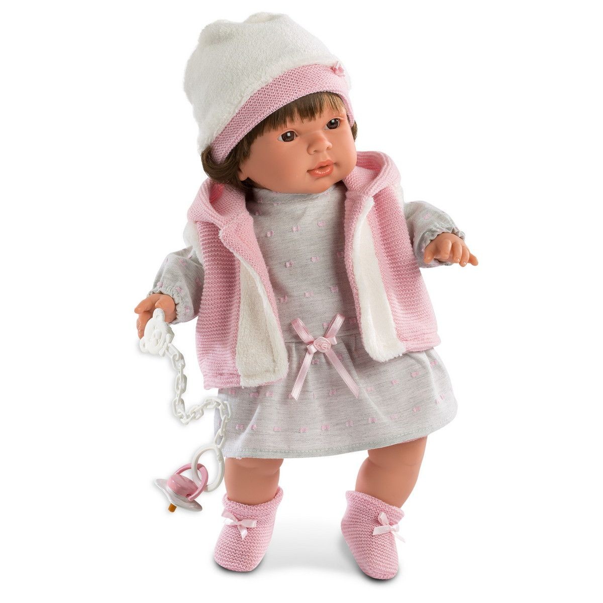 Carla 42142 ma 42 cm i wykonana jest z delikatnego, przyjemnego w dotyku winylu. Jej miękki brzuszek wypełniony jest wyściółką. Po wyjęciu smoczka lalka zapłacze i powie "mama, papa". Carla ma brązowe oczy otwarte na stałe oraz półdługie, figlarnie wywinięte włoski z grzywką w kolorze brązowym. Ubrana jest w doskonałej jakości szarą sukienkę z różowymi zdobieniami i kokardką oraz różowo-biały bezrękawnik z kapturkiem. W komplecie jest także biało-różowa czapeczka z misia oraz urocze skarpetki z kokardką.