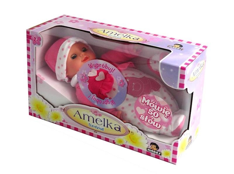 Strona główna Lalki bobasy Lalka Dzidziuś 34 cm 50 słów Cena Netto: 50,90 zł. error_outline Produkt chwilowo niedostępny. Opis Lalka Amelka - DzidziuśMówi 50 słów.Wysokość: 34 cm