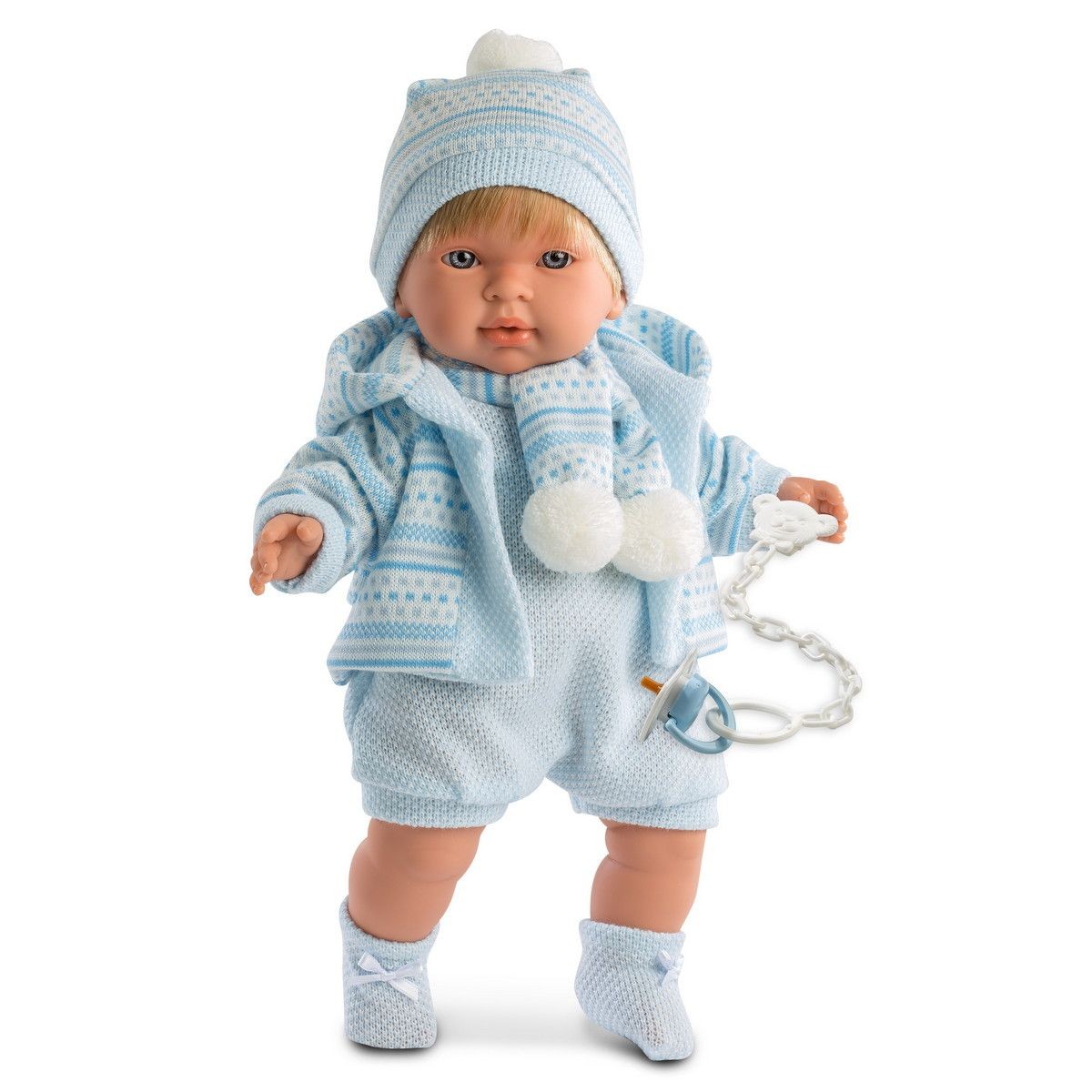 Miguel 42135 ma 42 cm i wykonany jest z delikatnego, przyjemnego w dotyku winylu. Jego miękki brzuszek wypełniony jest wyściółką. Po wyjęciu smoczka lalka zapłacze i powie "mama, papa". Miguel ma niebieskie oczy otwarte na stałe oraz krótkie, proste włoski z grzywką w kolorze blond. Ubrany jest w doskonałej jakości niebieskie piżamki do kolan oraz niebieski kaftanik we wzorki z kapturkiem. W komplecie jest także czapeczka i szaliczek z pomponami pasujące do kaftanika oraz urocze skarpetki z kokardką.
