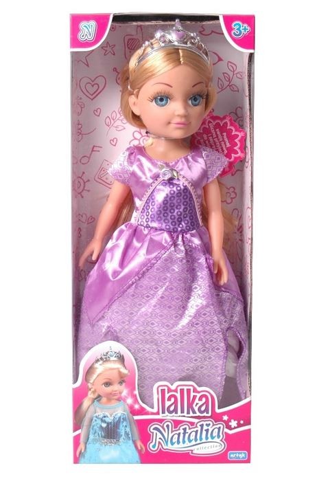 Jasnowłosa, niebieskooka księżniczka w przepięknej, pastelowej, balowej sukni w odcieniu fioletu– dla wszystkich fanek bajkowego klimatu i zabaw w bal oraz poszukiwanie księcia!