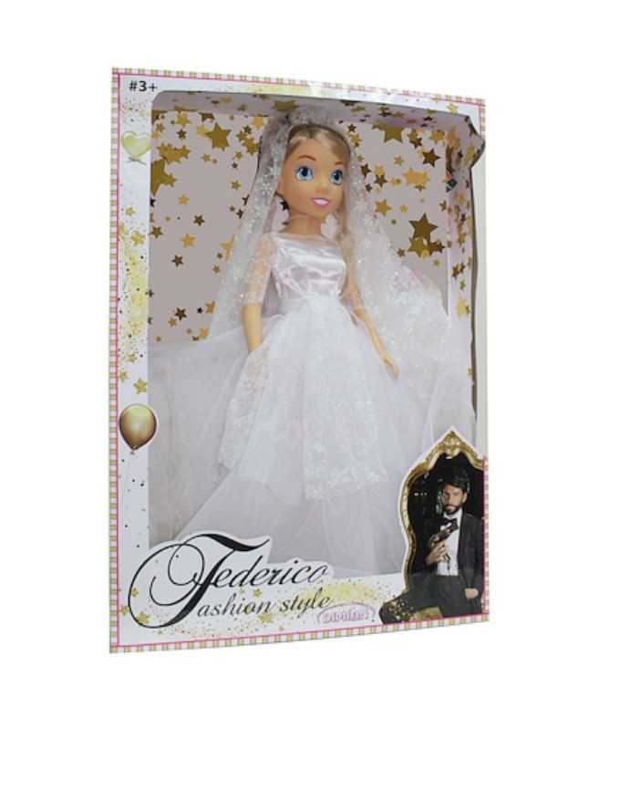 Lalka Panna Młoda ubrana jest w prześliczną suknię ślubną. Ma włosy upięte w kok na którym przymocowany jest długi welon. Wysokość lalki 80 cm.