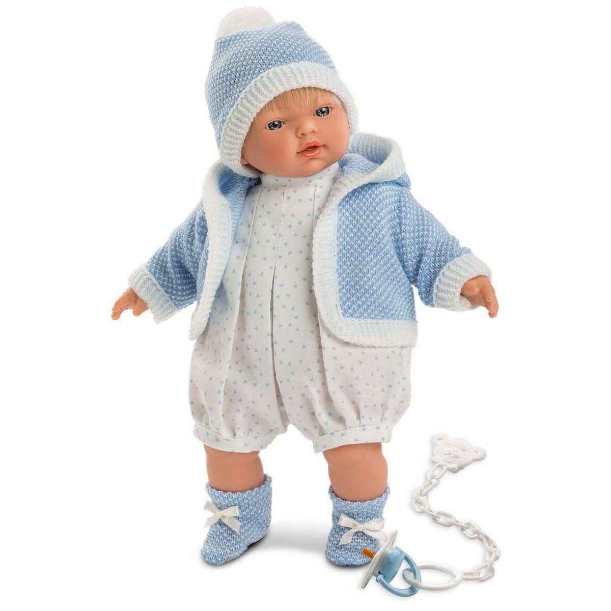 Roberto 33295 ma 33 cm i wykonany jest z delikatnego, przyjemnego w dotyku winylu. Jego miękki brzuszek wypełniony jest wyściółką. Po wyjęciu smoczka lalka zapłacze i powie "mama, papa". Roberto ma niebieskie oczy otwarte na stałe oraz krótkie, proste włosy z grzywką w kolorze blond. Ubrany jest w doskonałej jakości luźne body do kolan, z marszeniami u dołu nogawki, w kolorze białym z niebieskimi plamkami. Ma również kaftanik z białą lamówką i kapturkiem, urocze, dzianinowe, niebieskie skarpetki z kokardką oraz niebieską czapeczkę z białą lamówką i pomponem.