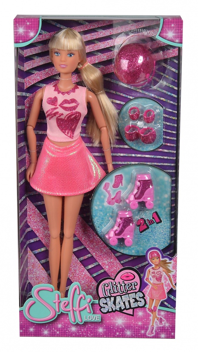 Steffi na wrotkach z ochraniaczami i błyszczącym kaskiem. Ma zginane w kolanach nogi i w łokciach ręce. Wrotki 2w1 - mają wmontowane buty na wysokim obcasie, które pasują do sukienki z błyszczącymi akcentami.