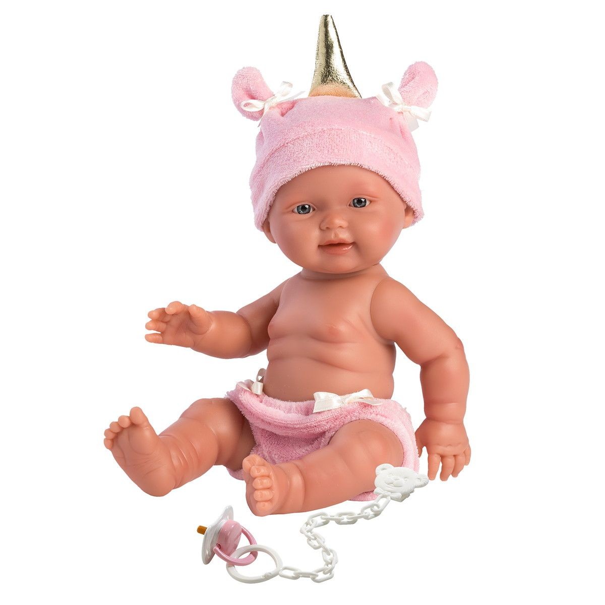 Lalka bobas 26 cm została wyprodukowana przez hiszpańską markę Llorens. Jest to zabawka wykonana z myślą o dzieciach. Jej urocze fałdki na brzuszku oraz delikatny uśmiech wzbudzają potrzebę opieki nad uroczą dziewczynką. Strój lalki składa się z różowej czapki jednorożca oraz różowych majteczek. Do zestawu dołączono dekoracyjny smoczek, który nadaje jej rozkosznego charakteru. Całe ciałko lalki zostało wykonane z przyjemnego w dotyku winylu, dzięki czemu można kąpać lalkę zanurzając ją w wodzie do poziomu szyi. Lalka została zapakowana w ozdobny karton. Kochamy hiszpańskie lalki Llorens!
