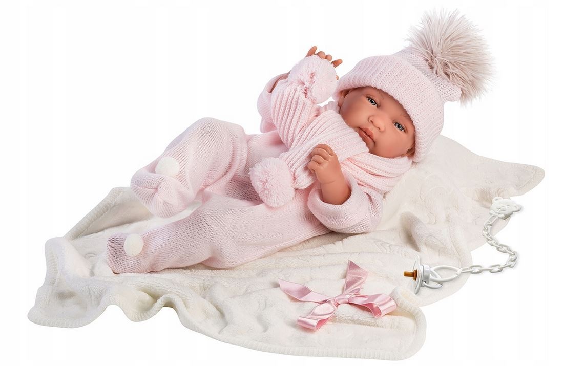 Lalka Tina 43 cm została wyprodukowana w Hiszpanii przez znaną markę Llorens. Tina jest cudowną dziewczynką, którą pokochają dzieci w każdym wieku. Jej urocza buźka, fałdki na ciele oraz malutkie rączki powodują, że wygląda jak prawdziwe dziecko. Całe ciało Tiny wykonano z przyjemnego w dotyku winylu, dzięki czemu można ją kąpać zanurzając w wodzie do poziomu szyi. Stylizacja Tiny składa się z różowych śpioszków, szalika i czapki. Do zestawu dołączono różowy kocyk oraz dekoracyjny smoczek dla lalki. Lalka została zapakowana w ozdobny karton. Kochamy hiszpańskie lalki Llorens!
