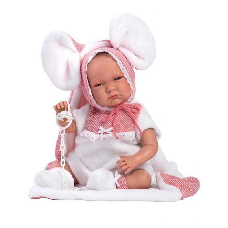 Lalka płacząca bobas dziewczynka 42 cm została wyprodukowana przez hiszpańską markę Llorens. Jest to wspaniała zabawka dla wszystkich dzieci w każdym wieku. Dziewczynka posiada okrągłą buźkę, malutki nosek i ustka oraz urocze fałdki na nóżkach i rączkach. Wszystkie te dokładnie dopracowane szczegóły sprawiają, że lalka wygląda jak prawdziwe dziecko. Jej materiałowy brzuszek został wypełniony miękką wyściółką co sprawia, że przytulanie lalki bobas jest jeszcze przyjemniejsze. Gdy naciśniemy lalkę na brzuszku, będzie płakać i wołać mama, papa. Lala w zestawie posiada kocyk z fantastycznymi uszami myszki. Można nim owinąć lalkę i przewiązać ją sznureczkiem. Lalka została zapakowana w piękny prezentowy karton. Kochamy hiszpańskie lalki Llorens!