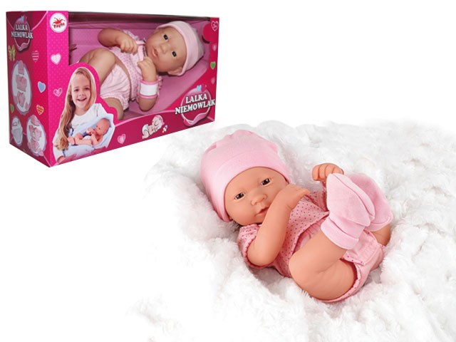 Lalka noworodek (38 cm) ubrana w kolorowe ubranko i czapeczkę. Na rączce ma etykietkę, na której można wpisać imię bobasa.