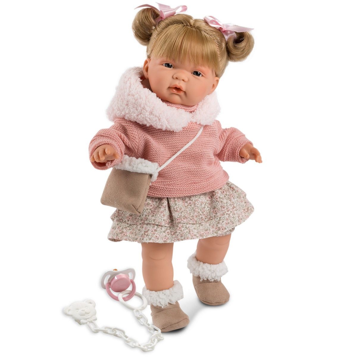 Lalka Joelle 38326 ma 38 cm i wykonana jest z delikatnego, przyjemnego w dotyku winylu. Jej miękki brzuszek wypełniony jest wyściółką. Po wyjęciu smoczka lalka zapłacze i powie "mama, papa". Joelle ma niebieskie oczy otwarte na stałe oraz półdługie, proste włosy z grzywką koloru blond. Włoski są związane w kucyczki różową tasiemką. Ubrana jest w doskonałej jakości jasnoróżowy sweterek z kapturkiem z białego, puszystego kożuszka i w kremowo-różową spódniczkę. W komplecie są także kremowa torebka i krótkie kozaczki obszyte białym kożuszkiem.