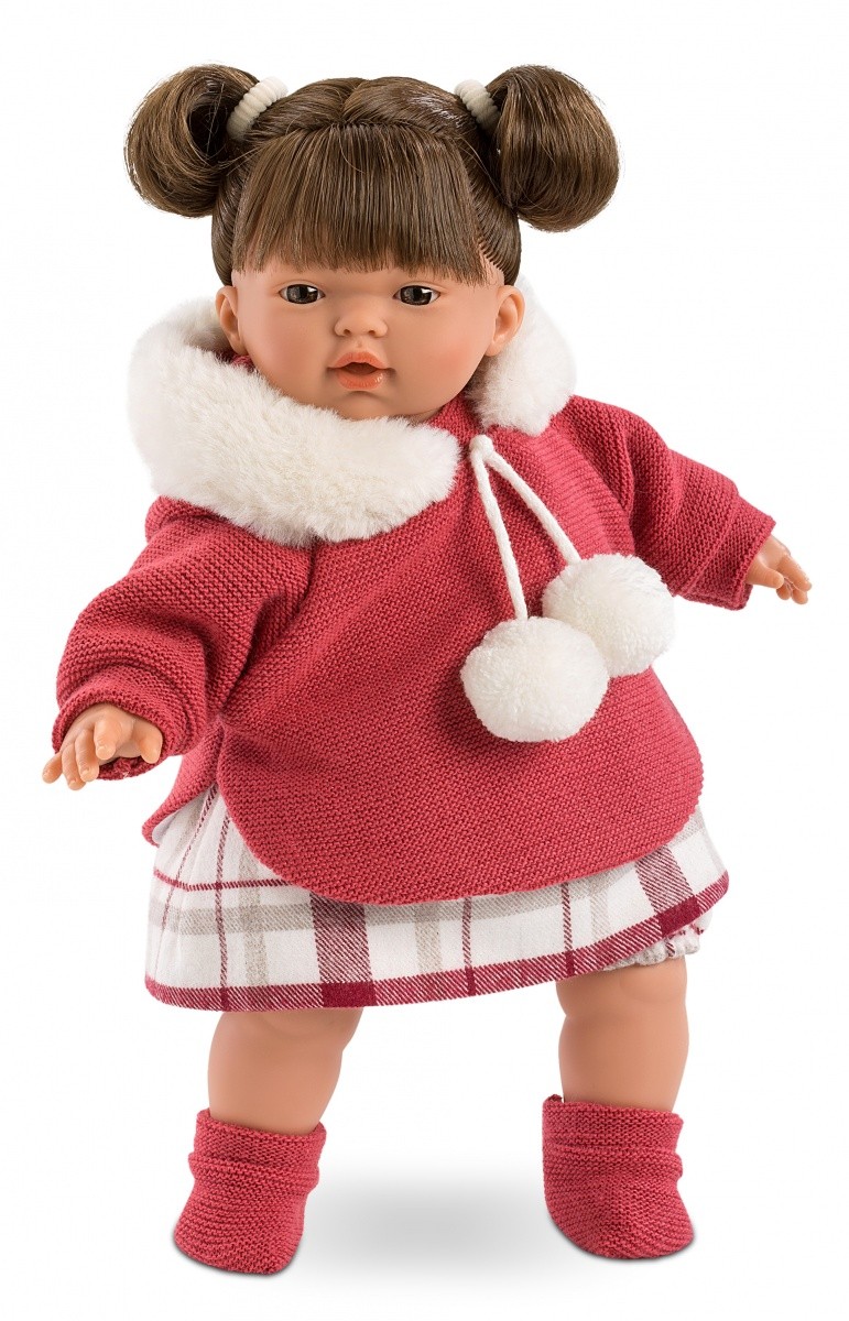 Jej ciało zrobione jest z przyjemnego w dotyku winylu a brzuszek wypełniony miękką wyściółką. Po wyjęciu smoczka bobas zapłacze i zawoła: mama, papa! Główkę naszej lalki zdobią dwie kiteczki. Tatiana ubrana jest w czerwony sweterek z futrzanym kapturem i pomponami, białą spódniczkę w czerwoną ratę oraz skarpetki pasujące do kompletu. Lalka zapakowana jest w kartonowe pudełko, idealne na prezent.