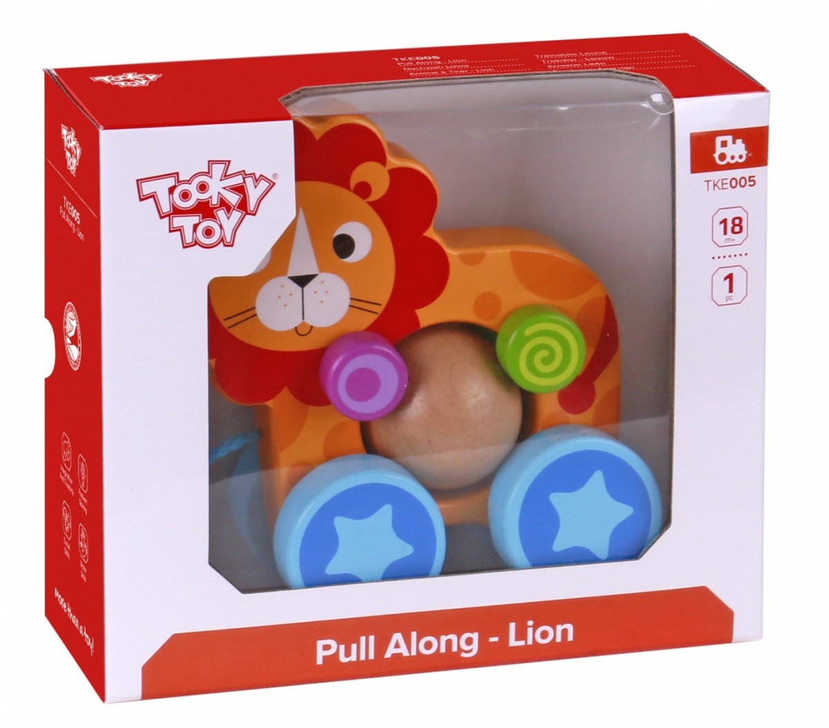 Drewniany Lew ma kółka i sznureczek do ciągnięcia. Dziecko, które opanowało zdolność samodzielnego chodzenia może zabrać Lwa na spacer.