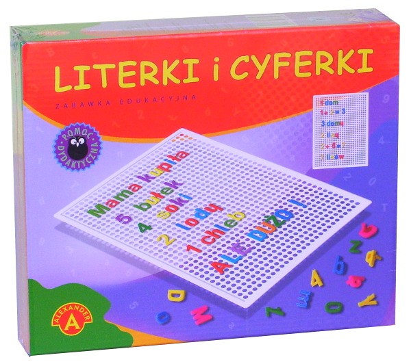 Składa się z perforowanej tablicy, zbioru dużych i małych literek oraz z zestawu cyferek. Literki i cyferki mona wpinać w otwory tablicy, układając w ten sposób wyrazy, zdania i proste działania matematyczne. Pozwala również ćwiczyć cierpliwość i zręczność manualną. Zabawka przeznaczona: dla dzieci w wieku od 4 lat.