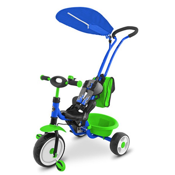 Wygodne siedzisko oraz miękkie oparcie zapewniają maksymalny komfort jazdy. Pięciopunktowe pasy utrzymują stabilność dziecka w siedzisku. Rowerek posiada prosty mechanizm działający na zasadzie sprzęgła. Po odłączeniu napędu, pedały mogą obracać się niezależne od ruchu przedniego koła, co przydatne jest podczas prowadzenia rowerka przez rodzica, bo ruch pedałów nie jest wymuszany przez ruch koła. Rowerek daje możliwość sterowania kierownicą za pomocą rączki do pchania, posiada hamulec ręczny, zdejmowany koszyk na zabawki, koła z komorami powietrznymi, 5cio punktowe pasy bezpieczeństwa z ochraniaczami z możliwością regulacji, regulowane w 3 pozycjach siedzenie, możliwość blokady kierownicy, aby rowerek jechał prosto oraz możliwość zablokowania pedałów.
