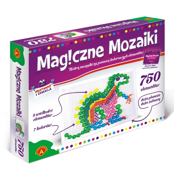 "Magiczne Mozaiki" to kreatywna zabawa edukacyjna dla dzieci, młodzieży i dorosłych. Do Waszej dyspozycji oddana zostaje plansza z mnóstwem otworów, w których należy umieścić różnej wielkości kolorowe elementy, by stworzyć rozmaite wzory i obrazy. Istnieje niemal nieskończona ilość kombinacji, a po wykonaniu ilustracji wystarczy, że wyjmiecie elementy i możecie zacząć od nowa. Do zestawu dołączony jest album zawierający ponad 100 inspiracji. Zabawa ćwiczy kreatywność i wyobraźnię, umiejętność sprowadzenia obrazów do najważniejszych cech.