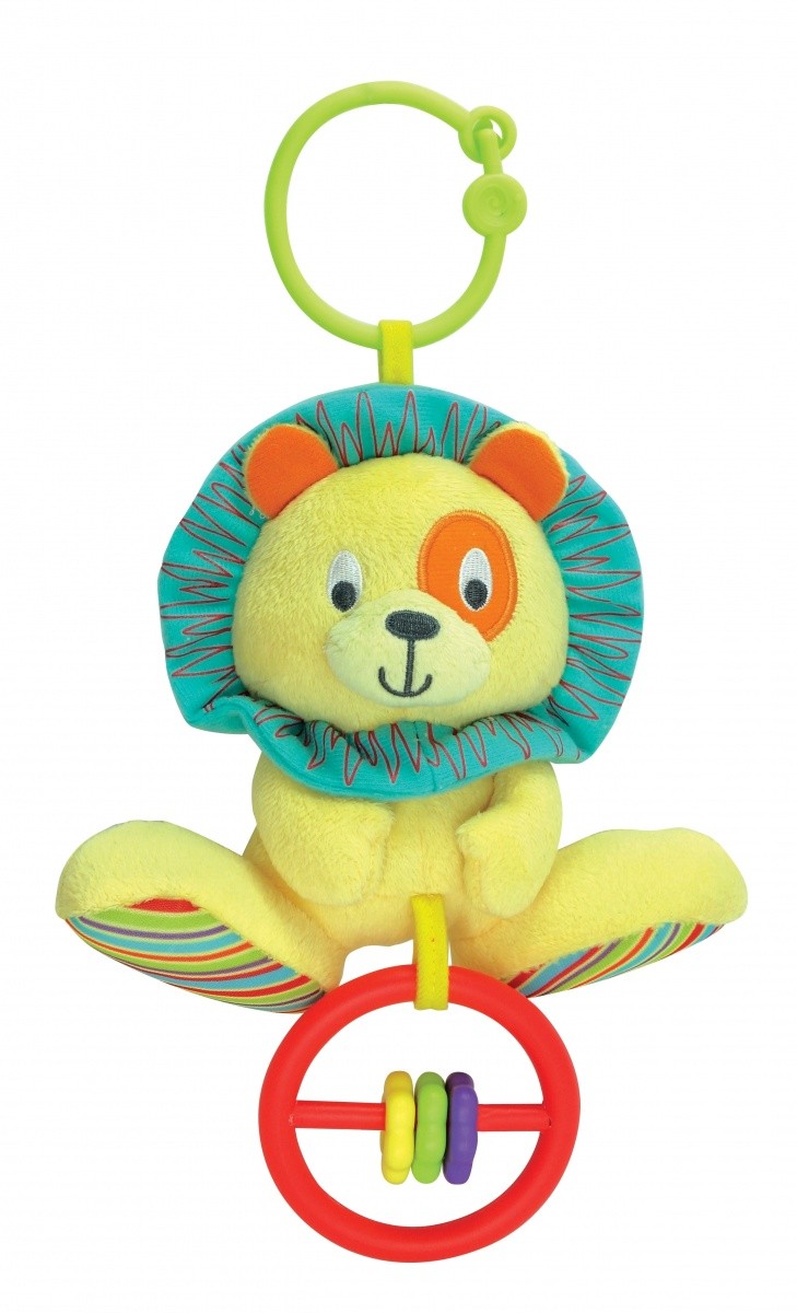 Kolorowy, grzechoczący Lew - zawieszka. Przypomina zwierzątko skupiając uwagę dziecka. Wykonany z doskonałych materiałów dzięki czemu jest mięciutki, kolorowy i bardzo przyjemny w dotyku. Posiada duży uchwyt mocujący służący do zwieszenia zabawki. Dziecko, potrząsając zabawką, usłyszy delikatny odgłos dzwoneczka. Dodatkowo posiada szeleszczące i ruchome elementy. Doskonale stymuluje małą motorykę dziecka.