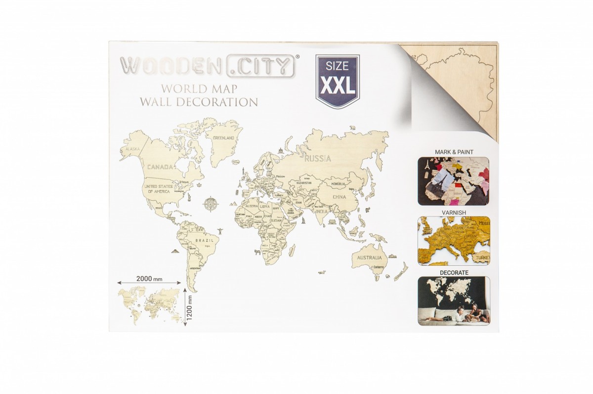 "Nigdy nie oszczędzaj na tym, czego nie możesz zrobić ponownie", powiedział słynny amerykański pisarz i podróżnik, Tony Wheeler. Czy odwiedziłeś wiele krajów w Europie i Azji? Czy mieszkasz w Ameryce lub niedawno przyleciałeś do tego kraju? W takim razie podróż masz we krwi! Być może właśnie odbywasz swoją pierwszą międzynarodową podróż. Twoja ścienna mapa będzie Twoim przewodnikiem po świecie wspomnień, doświadczeń i przygód. Czy posiadasz wiele wspomnień z różnych miast i krajów? Teraz możesz je sobie przypomnieć, siedząc przy stole z przyjaciółmi, dzieląc się wrażeniami i pokazując im na mapie miejsca, które odwiedziłeś. Jeśli podróżujesz z całą rodziną, dzieci z pewnością będą chciały namalować na mapie, gdzie były za pomocą farb akrylowych! Czy możesz oznaczyć odwiedzone kraje za pomocą flag? Tak, z łatwością! Drewno jest wystarczająco miękkie, aby wbić miniaturowe maszty flagowe. Podróżuj częściej, ale nie zapominaj, że Twoja mapa świata czeka na ciebie w domu, abyś mógł postawić następną "flagę".