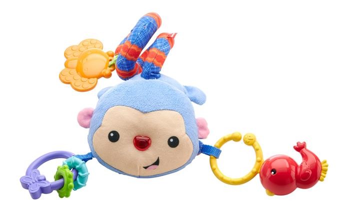 Ta zaprojektowana z myślą o wózku zabawka oferuje całe mnóstwo praktycznych i rozwijających aktywności. Naciśnij nos małpki, aby uruchomić światełka i melodie. Dziecko potrząsa ptaszkiem-grzechotką, przesuwa pierścienie i dotyka przyjaznych materiałów, przy okazji aktywizując swoje zmysły! Zabawka zawiera też przyjaznego motylka-gryzaczka. Przyczep miękki ogon małpki do wózka i zapewnij dziecku radosną, aktywizującą zabawę podczas spacerów. Pętelki na nogach przydadzą się do zaczepienia innych zabawek (sprzedawanych oddzielnie).