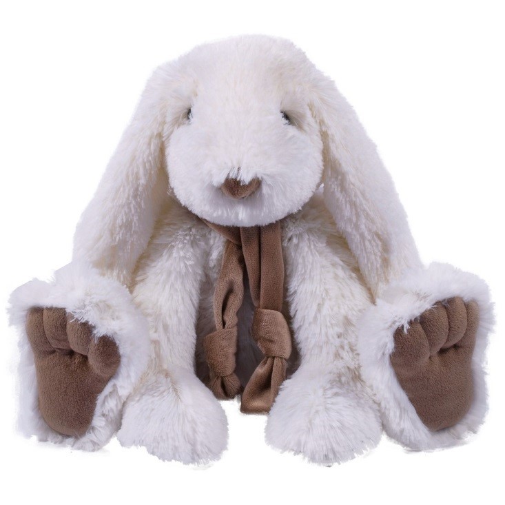 Siedzący króliczek w białym kolorze z brązowymi wstawkami na łapach oraz brązowym szaliczkiem. Jego miękkość, siedząca pozycja oraz długie uszy powodują że królik staje się nieodłącznym przyjacielem dziecka.