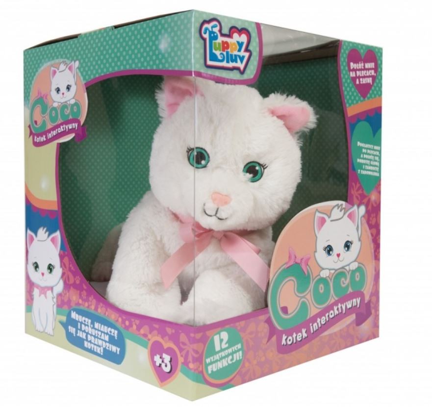 Milutki kotek Coco stanie się Twoim najlepszym przyjacielem. Jego miękkie futerko sprawi, że każde dziecko będzie chciało go głaskać i przytulać. Kotek potrafi m.in. mruczeć, miauczeć, poruszać łapkami i głową.