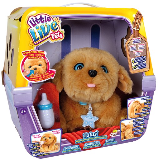 Poznaj Tulusia Twojego wymarzonego szczeniaczka. To bardzo grzeczny szczeniaczek, który tylko czeka aż go adoptujesz. On uwielbia się przytulać. Tuluś reaguje jakby był prawdziwym szczeniaczkiem. Gdy poklepiesz go po łebku lub pogłaszczesz po brzuszku, zareaguje wydając dźwięki. Tuluś otwiera też oczka i porusza łebkiem. Możesz go również nakarmić, a ze szczęścia wyda sekretne dźwięki. Zamyka oczy, gdy śpi i porusza brzuszkiem jak oddycha. Szczeniaczek ma 6 funkcji i 35 dźwięków.