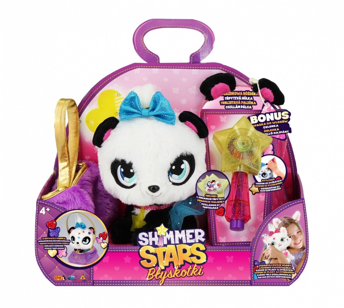 Poznaj Błyskotki! Urocze pluszaki, które uwielbiają błyszczeć. Gwiezdna różdżka skrywa setki lśniących ozdób dla Błyskotek oraz dziewczynek. Wszystkie ozdoby są wielokrotnego użytku, więc zabawa trwa bez końca.
