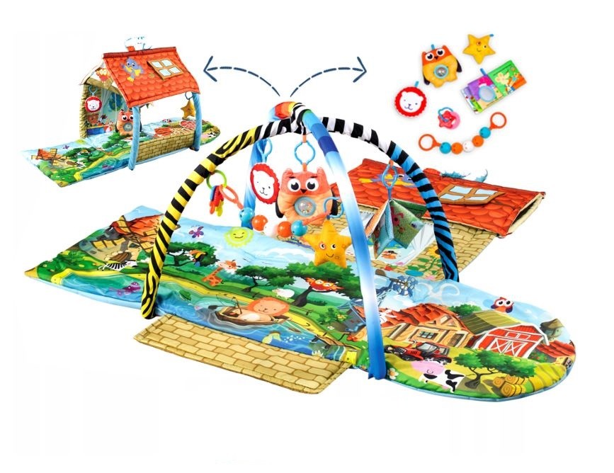 Dzięki składanym bokom i przekładanym pałąkom matę można przerobić w duży domek znacznie uatrakcyjniający zabawę dziecka.