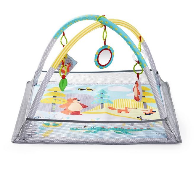 W zestawie znajduje się pałąk i aż 5 zabawek edukacyjnych: lusterko, szeleszcząca książeczka, gryzaczek liść, grzechotka, mięciutki miś.