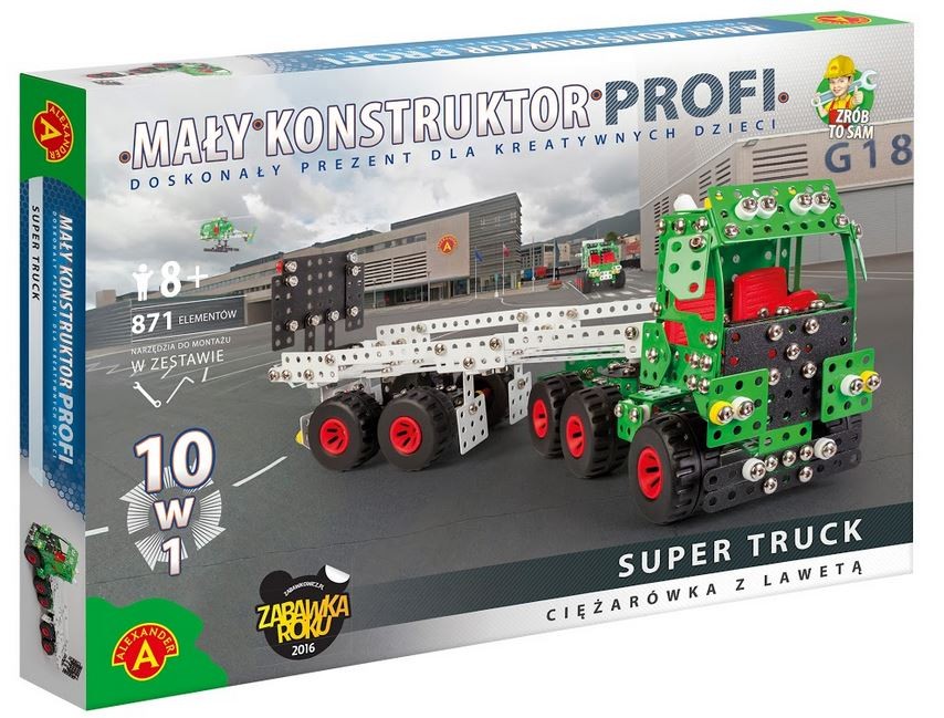Wyjątkowy model do samodzielnego montażu. W zestawie znajduje się aż 871 elementów w postaci kolorowych blaszek, śrubek, nasadek, elementów z tworzywa typu koła, siedzenia, kierownica.