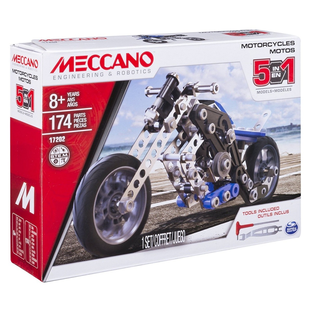 Zbuduj klasyczny motocykl i rozwiń jego nieziemskie predkości! Po zakończonej zabawie postaw swój motocykl w widocznym miejscu, aby inni mogli go podziwiać! Możesz również rozłożyć pojazd na części i stworzyć swoją własną konstrukcję. Pojazdy Meccano są wykonane z wytrzymałych metalowych części, dzięki czemu możesz modyfikować i przebudowywać swoje pojazdy w nieskończoność. Zestaw Model 5 w 1 ma 174 części, prawdziwe narzędzia oraz instrukcję krok po kroku.