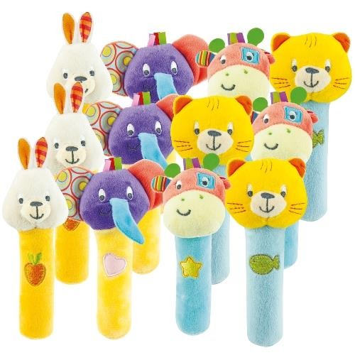 W zestawie znajdują się 4 wzory pluszowych zwierzątek: króliczek, słonik, żyrafka i kotek. Zabawka jest idealna do chwytania małymi rączkami maluszka. Jasne, żywe kolory i kontrastujące wzory zachęcają dziecko do skupienia wzorku a miękkie materiały i różne tekstury stymulują zmysł dotyku. Wystarczy delikatnie ścisnąć zwierzątko a zabawka piszczy. W główce umieszczono dzwoneczek, który przy potrząsaniu subtelnie dzwoni.