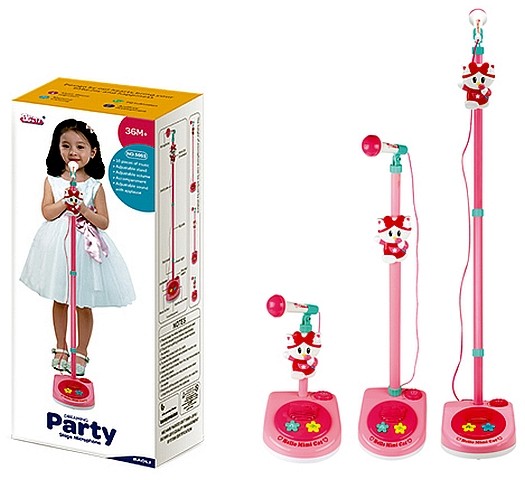 Mikrofon umocowany jest na teleskopowym statywie, dzięki czemu można go używać w 3 pozycjach: na siedząco, na stojąco na dwóch wysokościach dla młodszych i starszych dzieci. Zabawkę wykonano z nietoksycznych materiałów wysokiej jakości. Zabawka posiada funkcje: wgrane 6 różnych piosenek, odgłos braw oraz posiada regulację głośności.