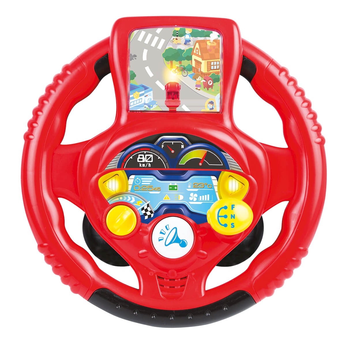 Samochodzik ze świecącymi reflektorami porusza się po ruchomym ekranie. Dzięki klaksonowi dziecko może trąbić, ostrzegając niesfornych kierowców. Kierownica ma regulowaną podstawkę.