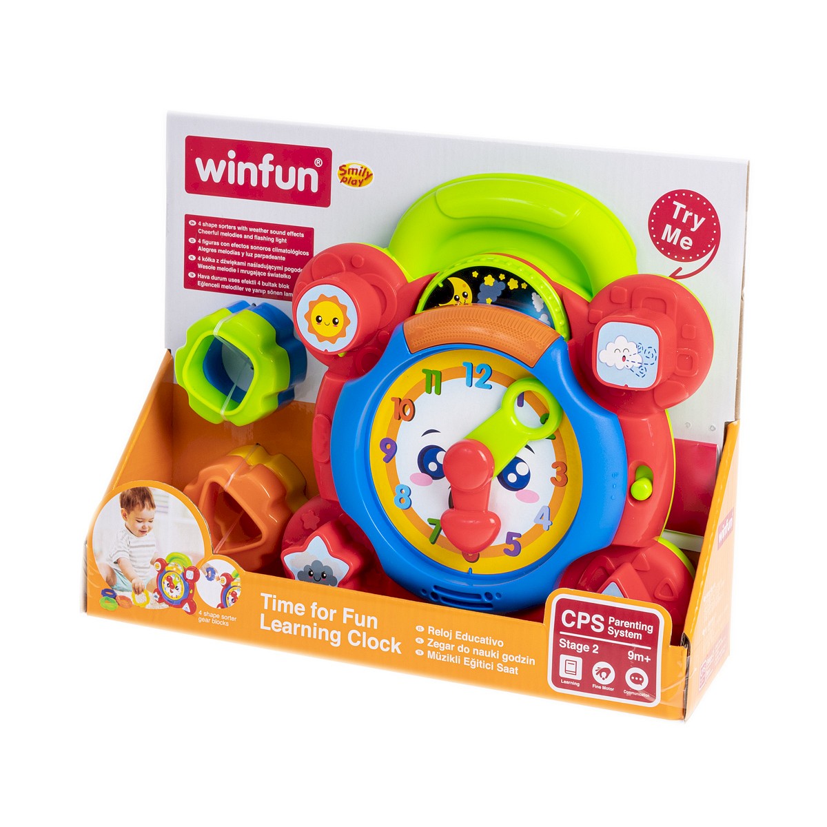Mój Pierwszy Zegar pomoże maluszkowi w nauce cyfr, godzin i rozpoznawania kształtów. Obrotowa tarcza pokazuje pory dnia: dzień i noc. Kiedy dziecko zacznie przesuwać wskazówki usłyszy tykanie zegara i odgłosy dopasowane do ustawionej pory dnia: wesołe dźwięki podczas dnia lub odgłosy ziewania.