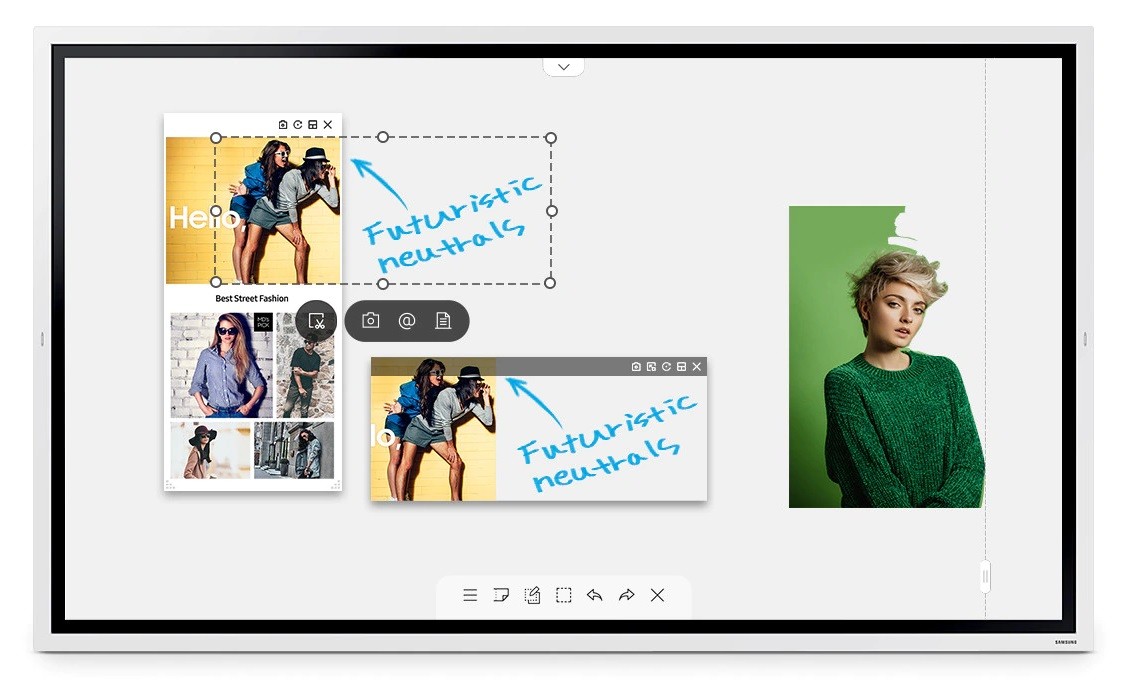 Notatki. Samsung Flip 2 pozwala Ci nanieść notatki na każde tło. Wystarczy kliknąć przycisk warstwy notatek, by w dowolnej chwili cieszyć się płynnym pisaniem na wyświetlanych treściach, nie zmieniając niczego, co znajduje się na oryginalnym tle.